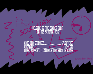 WELCOME TO THE SECRET PART IN DIZ SCOOPEX DEMO! CODE AND GRAPHICS...............SPYCATCHER CHIPTUNE...........................HI-LITE MORAL SUPPORT....MONGOLE AND PACO DA LAMER