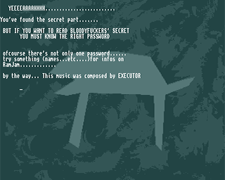 | Booting disk 2 will reveal a hidden part. You can use the following words in the input-field: "EXECUTOR", "FLENDER", "DEUS", "VAN HALIEN", "POSDNUOS", "SZONE", "LITTLEJOINT", "MASE", "PINOCCHIO", "FUCKER", "BLOODY", "CASE", "BAR", "GREETS", "MESSAGES", "SCENE", "ADDRESSES", "ADD2", "ADD3" & "BOARDS" |