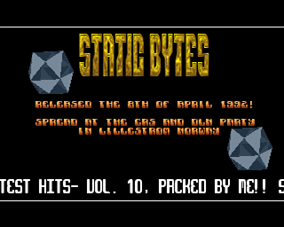 QUACKBUSTER BRINGS YOU -ALL TIME GREATEST HITS- VOL. 10, PACKED BY ME!! SPREAD IT! THE REASON WHY I AM HERE IS THAT I HAVE SOME INFORMATION ABOUT THE SUMMIT 92 PARTY! IT WAS SUPPOSED TO BE HELD BY US, REDNEX AND KEFRENS, BUT SINCE THE MAIN ORGANIZER, SLAMMER OF EX-REDNEX, JOINED UP WITH ANARCHY, THERE WONT BE SUCH A THING! SORRY! NOW THAT THIS IS DEALT WITH, I FEEL IT ONLY FAIR TO WARN YA... I AM IN A P S Y C H O T I C MOOD! THIS TIME MY HEADBANGER SCROLL IS CAUSED BY THE LIKES OF GUNS N ROSES AND NIRVANA! FURTHERMORE: MY MIND IS MENTALLY DISTURBED (NOTHING NEW?) DUE TO THE FACT THAT ME AND SLAMMER OF ANARCHY WAS OUT PARTYING YESTERDAY! ...AND I HAVE ONLY JUST GOT UP!!! SO THINGS JUST CANT GET BETTER... IN THIS SCROLLER WE HAVE SOME PROMINENT GUEST WRITERS! FIRST OF ALL, I AM GONNA WRITE SOME IDIOTIC, SENSELESS NONSENCE! (...OG SAA ER DET SLEMT! -ED) AFTERWARDS SLAMMER OF ANARCHY WILL BE ENTERTAINING YOU (? -ED) AND FINALLY WE WILL LET MARVEL OF STATIC BYTES WRITE SOME WISE WORDS (IGNORING THE FACT THAT HE IS SITTING IN NORWAY, MANY MILES AWAY!) LAST AND LEAST MY GREETINGS TO THOSE WHO DESERVE IT (AND THOSE WHO DONT) WILL FOLLOW... OK... VIDSTE I AT -RETALIATOR- PAA PC ER F...... HURTIGT!?! GLLP, SIGER JEG BARE! LETS HAVE BREAKFAST!!! TAKE IT AWAY, SLAM..... JA, TAK FOR AEREN RASMUS! HMMM, ESTRUPS KODE ER HMMMM INTERESSANT. JA MAN MAA JO SIGE AT DET ER MEGET INSPIRERENDE FOR EN KODER (SOM MIG) AT SE EN ANDEN KODERS SOVS. I LOVE YOUR SELF-ACTIVATING MOUSE, QUACK! IT IS NICE THAT YOU DECIDED TO USE THE REQ.LIB, EGGSTRUP (IT IS EASTER SOON! -ED). NOW I DONT HAVE TO RESOURCE YOUR CODE AGAIN (HEHE)! RASMUS TELLS ME THAT YOU ARE GOING TO NORWAY IN THE EASTER HOLIDAY. DUMDEDUM... I VIDSTE NOK IKKE LIGE AT JEG ER OPPE OG RINGE, SAA MAN SKAL ALDRIG SKRYGE FORDI FJUNKEREN FLISKLER NAAR GRUGLERET DRYKKER FRA ILDERYFSKREREN. FODSELSDAG BAGLAENS ER GADSLESDOF! (EH? -ED) GREETZ TO XIENCE. DU ER JO NOK ER SJOV FYR, HVA? ALSO GREETZ TO JONAS. SEND SAA DEN SATANS SJOVE SOVS! PIPSVANSEN/CRYSTAL: HVORFOR? HVEM? HVAD? GET OUTTA MY FACE, JERK? NIGGER-JUST: DU KORER BARE FOR SJOVT! AIRWALK: LAVER DU NOGET GFX TIL LE JOUX DE CHOUGE FRAICHE L.E.M? NU GIDER A IKK MER! HIT IT MARVEL! HELLO EVERYBODY! WELL, TO MAKE THIS SHORT, I WILL ONLY GIVE SOME WET KISSES TO MY BEST FRIENDS IN THE SCENE!! OK, HERE WE GO: -TMB DESIGNS OF SILENTS-: HEI PAA DEG, KAMERAT! VEL, KUUUL GFX DU HAR (JEG LIKER STILEN DIN!), OG JEG ER ABSOLUTT ENIG MED DEG AT VI SOM SPISER CORN FLAKES MAA HOLDE SAMMEN OG UTRYDDE FLATLUS... -ELMER OF SYMBIOSIS-: HELLO BUDDY! I JUST HAVE TO SAY THAT YOUR LETTERS ARE REALLY COOL AND LONG, AND I AM ALWAYS LOOKING FORWARD TO GET A NEW LETTER FROM YOU. BY THE WAY, YOUR GFX AND RAYTRACING ARE ABSOLUTELY STUNNING... -PROGEN OF ?SILENTS?-: SKAL JEG ORKE AT SKRIVE TIL DEG NAA DA?? NEI, DET GIDDER JEG IKKE. JEG KAN LIKE GJERNE RINGE DEG... -ZOOMAN-: NAA SITTER JEG HER OG HAR DET GOEY, HADDE DU VAERT HER HADDE JEG HATT DET ENDA GOEYERE, FOR DA KUNNE VI PRATE MED EN TOM POTETGULLPOSE (HEHE). -COKE-: HEI PAA DEG! KUUUL GRAFIKK JEG HAR SETT FRA DEG OG -DFF180-. JEG SER FRAM TIL AA MOETE DEG OG TOMMY! -CYPHER OF EOC 1999-: HELLO FRIEND! I HAVE A SUGGESTION!! WHY CANT WE TRY TO SEND TO EACH OTHER EVERY MONTH INSTEAD OF EVERY YEAR!! -ESTRUP OF STATIC BYTES-: HELLO MATE!! I JUST HAVE TO SAY IT!!! YOU ARE THE COOLEST CODER!! (...MEN MEST OM SOMMEREN! -ED) SEE YA! -QUACKBUSTER OF STATIC BYTES-: AAAAAH! HELLO FRIEND! I AM LOOKING FORWARD TO MEET BOTH YOU AND ESTRUP! YOU ARE BOTH COOL GUYS! (SO TRUE! -ED) -ACE-: WHEN ARE YOU GOING TO JOIN A GROUP??? EN TING DU MAA HUSKE: LABAN (OR ZABAN? -ED) SEIGMENN STREKKER SEG LITT LENGER!! -GONZA OF LSD-: YOU ARE A COOL SWAPPING PAL. WELL, I HAVE NOTHING MORE ON MY MIND TO SAY TO YOU! -MORTY OF EUROSWAP-: HEI PAA DEG MORTEN. JEG FAAR VIRKELIG UNNSKYLDE ALLE MINE DELAYER. JEG KAN IKKE LOVE AT JEG ALDRI KOMMER TIL AA VAERE TREG MERE, FOR DET LOEFTET VILLE JEG ANTAGELIG BRUTT. MEN JEG HAAPER IKKE DET GJOER DEG ALTFOR SINT AT JEG ER LITT TREG IBLANDT... -ELWOOD-: HEI PAA DEG MIN GODE VEN!! JEG GLEDER MEG TIL AA SE HVILKEN GRUPPE DU JOINER, HILSEN JOACHIM... -HELGE W. J.-: NAA... VEL... HVA SKAL JEG SKRIVE? JO!! NAAR SKAL DU JOINE EN GRUPPE??? -RAFIQ-: JEG SKJOENNER DEG MEGET GODT NAAR DU KJOEPTE EN C-64 FOR AA SPILLE -BOULDERDASH- (HAHA). SEE YA! -RAM-: MUSIKKEN DIN ER VIRKELIG BRA!! JEG KAN IKKE SI AT DU HAR FORBEDRET DEG, FORDI DU HAR IKKE LAGET NOE I DET SIDSTE!! HAAPER DU FORTSETTER MED AA LAGE MUSIK! -JACK-: WHAT THE FUCK SKAL JEG SKRIVE TIL DIG??? JEG KAN LIKE GJERNE PRATE MED DEG! -PLAYBOY OF STATIC BYTES-: HI! IT IS NICE TO HAVE EVEN ONE MORE COOL GUY IN STB AS MY FRIEND! I AM LOOKING FORWARD TO MEET YOU! WELL, THATS IT! CONTACT ME FOR SWAPPING GFX (LOOK ABOVE! -ED). BYE FROM MARVEL... LETS HEAR IT FOR THE GREETINGS... ADDONIC (AQUA, MAC), AGILE (FRED), ALCATRAZ (MICROPAL, CONTROL), AMAZE (THE HUSTLER), ANARCHY (SLAMMER, CONQUEST, PINNY), AWESOME (WONDERBOY), BRAINSTORM, BYTEBUSTERS (PROSECUTOR), CAPITAL (CHEAD), CRIONICS, CULT (CYBERSONIK, EASLEY, MR. MOUNT), CURACY (X-TRA), DELIGHT (DRAKE), DUAL CREW (VULCAN), EXOTIC MEN (ED-209), FRANTIC (TECHNOID), FUSION (OPTIMA), JOKER (PETERS), JUST, KEFRENS (HAWKEYE), MAJIC 12 (VECTOR), MELON DEZIGN OF CRYSTAL (HITHANSEN), MIDNIGHTSUN (SWANTTI), NOXIOUS (WINGER), PALACE (CASANOVA), PARADISE (BRUTUS), PIRATES (MANCHILD), PURE METAL CODERS (LONERIDER), RAM JAM (ACBS), REBELS (OMEGA, JANITOR), REDNEX (AIRWALK, JONES), REFLECT (DEVIL), SANITY, SCOOPEX, SERIOUS (TUBORG, LUNATIC, TOWIE), SILENTS (DARYL, RAVE), SUPPLEX (FRAP), S!P OF TRSI (WARHEAD), TEK (MAC), TEF (MR. BITE), TRSI (MICRONIX), VANISH (MASSIVE), VECTRA (MORRISON), VEGA (STYLE), VOICE (DEXTER), ZAPOTEK WRAP!