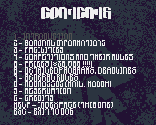 COMPO MACHINES: - AMIGA: A1200 + BLIZZART 1230/4MB , AGA IS ALLOWED TO USE EVERYWHERE! - PC:I486DX2-66/4MB RAM/TSENG ET4000 W32 OPTIONALLY: GUS 1MB RAM OR SOUND BLASTER PRO OR SOUND BLASTER 16 EMS, XMS OR RAW MEMORY AVAILABLE - C64: COMMODORE C64 (EXTRA 256K RAM AVAILABLE) COMPETITIONS: AMIGA - AMIGA DEMO. (FAST RAM AND HARDDISK ALLOWED!) MAX. SIZE: 4096KB HD (4 DISKS) AND 4MB FASTRAM. MAX. RUNNING TIME: 8 MINS. HARD-DISK INSTALLER (OR A TEXT HOW TO INSTALL) IS NEEDED! AGA ALLOWED. IT'S NOT NEEDED, BUT IT'D BE GREAT IF IT RETURNED TO DOS. - AMIGA 40K INTRO. (40960 BYTES) FASTRAM ALLOWED! MUST RETURN TO DOS! RUNNING TIME: 5 MINS. AGA ALLOWED. - AMIGA 4K. (4096 BYTES) FASTRAM ALLOWED (BUT WHY?!) AND SHOULD RETURN TO DOS. AGA ALLOWED. PC - PC DEMO. MAX. SIZE: 4096KB (4.194.304 BYTES), RUNNING TIME: 8 MINS. THE DEMO MUST RUN ON 386 SX-25 WITH 4MB RAM, MUST BE 100% VGA COMPATIBLE AND THE PROGRAM MUST RETURN TO DOS - PC 64K INTRO. (65536 BYTES), RUNNING TIME: 5 MINS. THE INTRO MUST RUN ON 386 SX-25 WITH 4MB RAM, MUST BE 100% VGA COMPATIBLE AND THE PROGRAM MUST RETURN TO DOS - PC 4K INTRO. (4096 BYTES), RUNNING TIME: 5 MINS. THE INTRO MUST RUN ON 386 SX-25 WITH 4MB RAM, MUST BE 100% VGA COMPATIBLE AND THE PROGRAM MUST RETURN TO DOS. MUSIC IS ALLOWED TO USE! C64 - C64 DEMO. MAX. SIZE: 2 DISKS RUNNING TIME CAN BE MAXIMUM 8 MINS. (OR WE RUN THAT FOR 8 MINS, ANYWAY) ANY KIND OF CRUNCHER IS ALLOWED. - C64 GFX. ANY NUMBER OF COLOURS (E.G FLI) AND RESOLUTION (EVEN INTERLACE!), BUT IF IT'S SPEACIAL, A VIEWER IS NEEDED, TOO. OTHER - FM MUSIC COMPO. (CHIPMUSIC COMPO): C64, ADLIB (PC), AMIGA (FUTURE COMPOSER OR MODS CONSIST OF CHIPSOUNDS ONLY) SPECIFICATION: 3 CHANNEL MUSICS WITH ADSR SOUNDS ONLY ARE ACCEPTED! PLAYING TIME: 3 MINS. WE NEED A PLAYER, IF YOUR SONG DOESN'T SUPPORT THE USUAL PLAYERS ON C64, AMIGA OR ON PC. - 4 CHANNEL MUSIC. MAX. SIZE: 1MB - PLAYING TIME: 3 MINS. BORING AND MONOTON MUSICS (E.G LAME TEKKNOS) WILL BE EXCLUDED ON THE DISK YOU GIVE US MUST SIGN WHAT COMPUTER YOU WANNA PLAY IT ON - MULTICHANNEL MUSIC IN THIS COMPO AMIGA (E.G OCTAMED) AND PC (E.G S3M) MODULES ARE ALLOWED TO CONTRIBUTE. THE MUSIC CAN BE MAX. 32 CHANNEL. THE USED SAMPLES CAN BE SAMPLED ON 16 BITS AS WELL. MAX. SIZE: 1MB - PLAYING TIME: 3 MINS. BORING AND MONOTON MUSICS (E.G LAME TEKKNOS) WILL BE EXCLUDED ON THE DISK YOU GIVE US MUST SIGN WHAT COMPUTER YOU WANNA PLAY IT ON - GRAPHICS COMPO. ALL POSSIBLE RESOLUTIONS (MAX. 1024 X 768) AND COLOURS ARE ALLOWED BUT ONLY HANDDRAWN GRAPHICS ALLOWED TO COMPETE - AND PREFEREBLY OWN PICTURE (NOT COPY) SCANNED PICTURES WILL BE AUTOMATICALY DISQUALIFIED. IF THE PICTURES ARE NOT KNOWN BY MULTIVIEW, AD-PRO, IMAGE ALCHEMY OR QPEG THEN VIEWER IS ALSO NEEDED. SO, PLEASE, RATHER USE WELL-KNOWN FORMATS (JPG, GIF, IFF, PCX ETC.) ON THE DISK YOU GIVE US MUST SIGN WHAT COMPUTER YOU WANNA SHOW IT ON - RAYTRACE COMPO RENDERED PICTURES (NOT OBJECTS) - FORMAT: ANY WELL-KNOWN (JPG,GIF,IFF ETC.) ANY RESOLUTIONS ARE ALLOWED (HAM8, SVGA, TRUECOLOUR AS WELL) ON THE DISK YOU GIVE US MUST SIGN WHAT COMPUTER YOU WANNA SHOW IT ON - ANSI GFX COMPO IF YOU ARE A SKILLED ASCII ARTIST, YOU COULD SHOW YOUR TALENT HERE. ANSI CONVERTER (E.G ILBM TO ASCII) IS NOT ALLOWED TO USE! THE ASCIIS WILL BE SHOWN IN 78 X 25 MODE ON AMIGA OR WITH ACIDVIEW ON PC IN 80 X 25 OR IN 80 X 50 MODE. RENDERED OR CONVERTED ANSIS WILL BE AUTOMATICALY DISQUALIFIED ON THE DISK YOU GIVE US MUST SIGN WHAT COMPUTER YOU WANNA SHOW IT ON - WILD COMPO ANY KIND OF PRODUCTIONS, ON ANY KIND OF MACHINES (IF IT'S NOT PC OR AMIGA, COMPUTER MAY NEEDED!) ANIMATIONS ARE ALSO ALLOWED TO COMPETE HERE. RUNNING TIME: 15 MINS. SIZE: ANY, BUT MUST BE ON 1 HARDDISK! (EVEN 5 GB AS WELL) IF THE ORGANIZERS HAVEN'T GOT THE NEEDED HARDWARE SUPPLIES, THEN IT'S ALSO NEEDED (E.G MAC, FALCON) THE CONTRIBUTIONS MUST BE GIVEN ON HD OR ON VHS CASSETTE (FOR VIDEO ANIMS) OF COURSE, HARDDISKS AND VIDEOCASETTES WILL BE GIVEN BACK AFTER THE COMPETITION. VIDEO ANIM: MAX. 15 MINS AND THE PRODUCTION MUST SHOW IT WAS MADE FOR THIS PARTY ONLY! - LAMER DEMO COMPO YOUR DEMO MUST BE THE LAMEST ONE TO WIN! EVERYBODY HAS CHANCE HERE! OWN MADE DEMOS PROGRAMMED IN AMOS, BASIC ETC. ARE ALSO ALLOWED TO COMPETE! BUT IT MUST BE EXECUTABLE FROM DOS! SIZE: ANY, BUT MUST BE ON 1 HARDDISK! (EVEN 5 GB AS WELL) ONE GROUP CAN CONTRIBUTE WITH ONE PRODUCTION ONLY, HERE! ANY KIND OF PACKER IS ALLOWED TO USE, BUT THE REAL LAMER DOESN'T PACK. IF YOUR CONTRIBUTION IS LONGER THAN 3 DISKS, YOU MUST GIVE THE HD TO US (YOU'LL GET IT BACK OF COURSE, AFTER THE COMPETITION). FUN PRODUCTIONS PREFEREBLY! ON THE DISK YOU GIVE US MUST SIGN WHAT COMPUTER YOU WANNA SHOW IT ON - BEETHOVEN COMPO YOU GET 10 SAMPLES (THAT YOU CAN LISTEN TO AND CHECK OUT FOR 7 MINS) , AND THEN YOU MUST COMPOSE A SONG (OR MORE, IF YOU'RE EXPERT) IN 35 MINS ON DISCONNECTED SOUND PANELS. ANY KIND OF UTILITY IS ALLOWED TO USE, WHICH WILL BE GIVEN TO YOU BY THE ORGANIZERS! - SUPERSTARDUST COMPO THE COMPETITION IS RUNNING PARALLEL ON 4 A1200. YOU CAN USE YOUR OWN JOYSTICK, IF YOU WANT. 3 LIFE OR 4 MINS IS THE PLAYING TIME. DEADLINE TO COMPETE: 16H - 3RD OF NOVEMBER - DOOM COMPO 4 I486DX2-66 (8MB RAM, GUS, FAST VIDEOCARD, ETHERNET, MOUSE AND "DOOM" KEYBOARD) CONNECTED TOGETHER AND YOU PLAY DEATHMATCHES AGAINST OTHER PLAYERS - OWN KEYBOARD IS ALLOWED TO USE - PLAYING TIME: 10 MINS/ROUNDS THE PLAYERS PLAY IN GROUPS OF 4, AND ALL PLAY WITH ALL. DEADLINE TO COMPETE: 17H - 3RD OF NOVEMBER - MORTAL KOMBAT II COMPO THE COMPETITORS PLAY ON A I486DX2-66 (8MB RAM, GUS, FAST VIDEOCARD) AGAINST EACH OTHER (IN 2 PLAYER MODE). MAXIMUM 2X3 ROUND CAN BE PLAYED AGAINST EACH OTHER. ALL PLAY WITH ALL. ALL THE FIGURES CAN BE CHOSEN AND THERE'S NO TIME LIMIT. DEADLINE TO COMPETE: 17H - 3RD OF NOVEMBER - NIBBLES COMPO THE COMPETITORS PLAY DEATHMATCHES ON 4 PCS (I486DX2-66) PLAYING TIME: 4.2 MINS/ROUNDS. THE PLAYERS PLAY IN GROUPS OF 4, AND ALL PLAY WITH ALL. DEADLINE TO COMPETE: 17H - 3RD OF NOVEMBER - FUN COMPOS THE DARING ENTERPRENEURS PLAY CRAZY TEAM OF 5 TOURN