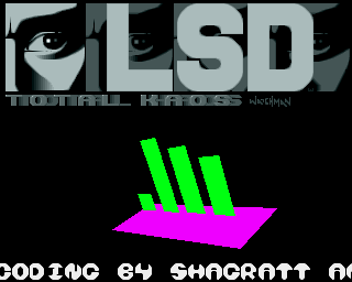 HELLO AND WELCOME TO A RAVE MIX CALLED -TOTAL KAOS- FROM LSD, BEFORE WE KICK OFF WITH THE MESSAGES, HERES THE CREDITS, CODING BY SHAGRATT AND MAXIMAN, MUSIC BY ECHO, AND GRAPHICS BY WATCHMAN. OK HERE WE GO WITH THE MESSAGES FROM ECHO... HELLO WORLD AND WELCOME TO RAVIN' WE'RE RAVIN'... OOOPS.. NO, I DIDN'T MEAN THAT REALLY, SO I'LL TRY THAT AGAIN... I'M SITTING HERE... BORED AS BUGGERY... SITTING NEXT TO ME IS A M8 OF MINE WHO'S GOT A CATTERPILLAR GROWING UNDER HIS NOSE. HAVE YOU EVER SEEN A GINGER CATTERPILLAR? NO? NEITHER HAVE I... HE ALSO USED TO HAVE A LOT MORE FACIAL GROWTH, BUT THE WIND CAME UP AND BLEW THAT IN-A-GAIN (POOR OLD MICHEAL FINNEGAN BLAH...) HE IS AS BLACK AS ICE AND NAMED XENO. BUT LESS ABOUT HIM... LETS TALK ABOUT ME! YEAH... BUT AS IT HAPPENS I'M GETTING PRETTY BORED OF THINKING OF CRAP STUFFZ TO WRITE, SO I'M GONNA TELL YOU ABOUT THIS MUSIC... INSPIRED BY MUCH OF THE OLDER 'RAVE' SOUNDZ, I DECIDED TO TAKE TO THE AMIGA AND FIGURED THAT RAVE IS A DODDLE TO WRITE BECOZ ANY FUKER CAN WRITE IT. EVEN A COMMUNE OF TONE-DEAF HEDGEHOGS IN A BAG WITH EAR-MUFFS ON! SO, ALTHOUGH THERE ARE NO HARD-CORE BEATS (BCOZ MY SAMPLER IS IN FAST'S HANDS AT THE MOMENT (THANX PAZZA)) IN THIS MUSIC, THE IDEA WAS THERE (AND IT'S THE THOUGHT THAT COUNT'S, AIN'T IT.) I HAVE PLAYED THIS AT RAVES NOW AND THEN (ON THE STAGE 'LIVE' WITH THE AMIGA, PROTRACKER AND 35K OR TURBO SOUND!) WELL, I'M GETTING EVEN MORE STUCK FOR DRIBBLE, SO NOW IT'S ONTO THE FEW GREETINGS TO PEOPLE IN THE VIRTUAL WORLD OF REALITY I ACTUALLY STILL KNOW.... YAZ/DIGITAL - YES, I KNOW IT'S SAD, BUT YOU STILL USED SOME OF THE SAMPLES.... ASSASSIN/DMX - HI THERE LEE! OK, SO WHEN'S THE DMX PARTY (DMX PARTY? WOT DMX PARTY?!) I'D LUV TO SAY HELLO TO SOME MORE FOLX, BUT I'M IN A FUCK OF A RUSH SO.... ERM.... BYE.. AND OVER TO WATCHMAN... DRUGIES BOOSERS STRUMPETS AND LOOSERS ITS YOUR OLD MATE WATCHY HERE WITH A FEW LITTLE MESSAGES TO A COUPLE OF FRIENDS. MUB... CHRIS YOU BLOODY LOUT IM A COMIN TO GET YA! ... PAZZA... HEY MARTIN, TULL RULZ ... DESTINY... PLEASE DONT MARRY MUB, HES FAR TO UGLY ... RED DEVIL... MATE ID LOVE TO SEND YOU A PACKAGE BACK BUT I JUST DIDNT GET YOURS, SORRY IF YOU THOUGHT THAT I WAS A PIG HEADED SON OF A BITCH, WELL HAVE TO MEET UP AT THE QUARTZ PARTY... GOLLUM... GO ON THEN FIFTY QUID AND ITS A DEAL ... SHANNON... MY MY YOU SOUND GOOD ENOUGH TO EAT... TORCH... DONT BE AFRAID BE VERY VERY AFRAID... BAA BAA... TIM MY OLD DRUGGIE HOPE TO MEET YA AGAIN SOON, SEND SOME GANJA DESIGN STUFF... FISHY FISHY FISH... HIGH RES HIGH RES NEVER TOUCH IT CAN HURT YOU VERY MUCH... TRIPPER... YOUR MOMS A HAMSTER AND YOUR DAD SMELLS OF ELDERBERRYS... JON FROM DUDLEY... THOSE WHO MOKE WOULD MOKE A TOKE, INDEFINATLEY KREST... NICE HIGH RES PICCYS DUDE, LETS HAVE A CHAT ONE OF THE DAYS... BERNARD SUMNER... RAVE SMELLS... EVERY ONE IN QUARTZ... THANX GUYS I REALLY NEEDED THIS PARTY... WELL THATS ABOUT IT, ERM I HOPE YOU LIKE THIS PRODUCTION WHATEVER IT IS AND REMEMBER TO HAVE A GOOD TIME ALL THE TIME, BECAUSE IF YOU DONT ITLL GET VERY BORING INDEED AND YOULL START LISTENING TO RAVE MUSIC, THEN YOULL TURN LIBERAL AND START VOTING FOR GUN CONTROLL AND FROM THEN ON ITS ALL DOWN HILL. SO TURN UP THE TULL MOKE A TOKE AND RELAX... FFP... AND OVER TO OUR FRIEND DEADBEAT... DEADBEAT HERE! SENDING MY RESPECTS AND REGARDS TO... DMAN, PAZZA, TORCH, DATA, CHIME (LSD)... CIARS AND RAZOR BLADE OF ALLIANCE... DAN AND 2TUFF OF CRYSTAL... RED DEVIL AND CLARVOYANT OF DUAL CREW... AUTOPSY OF SCOOPEX... KITARO OF FAIRLIGHT... INTREQ OF ROTOX OF DIGITAL... OVERDOSE... OK THATS THE LOT... BYEEEEEEEE... AND OVER TO PAZZA... HI DUDES, WELL, ITS THURSDAY NIGHT (6/8/92) AND WE HAVE JUST PUT GRAPEVINE TOGETHER, AND I MUST SAY IT IS THE BEST YET... BUT GRAPEVINE ISSUE 12 WILL BE EVEN BETTER. WELL WHAT CAN I SAY, IVE BEEN TOLD BY THE POLICE VIA MY SOLICITER THAT IM GONNA BE PROSECUTED FOR SOFTWARE THEFT, SO KEEP READING GRAPEVINE FOR UPDATES. ERR... MY CAT IS DUE TO HAVE KITTENS ON 12TH OF AUGUST, AND MY DOG IS STILL STUPID. TOMORROW WATCHMAN, BERNARD SUMNER, FISH, MUB AND AMB ARRIVE AT MY PLACE READY TO GO TO THE QUARTZ PARTY, WHICH IS WHERE WE RELEASE THIS. SHAGRATT AND MAXIMAN SHOULD ALSO SHOW UP AT MY PLACE, BUT SHAGRATT CANT MAKE THE PARTY, AND IM NOT SURE ABOUT MAXIMAN! MIND YOU IM ONLY GOING TO GET PISSED AND MEET MY FRIENDS! SHOULD BE KEWL! TIME FOR A QUICK ADVERT, CALL THESE KEWL BOARDS, ODYSSEY (WHQ) +1 314 644 0403. SYSOP: NIGHTWIND OR MILLENIA (UK DISTRIBUTION SITE) +44 (0)91 284 3142. SYSOP: KITARO. LETS TALK ABOUT THINGS I DONT LIKE, SUCH AS PEOPLE THAT CODE UTILITIES FOR LAMERS, SUCH AS CUSTOM CRUNCHER DECRUNCHERS, WHAT ELSE, PEOPLE THAT SAY THEY DONT LIKE THINGS ABOUT GRAPEVINE WHEN THEIR DISK MAGAZINE HAS THE SAME FEATURES HEHEHEHEHEHE AND YOU THINK IM JOKING! FILMS THAT ALAN DELON IS IN, WHY DO ITV SHOW THESE DUBBED FRENCH FILMS EVERY MONDAY NITE, AND THEY WONDER WHY SKY IS POPULAR! DONT YOU THINK THAT MARIELLA FROSTROP FROM VIDEO VIEW, HAS SAGGY TITS? AND SHE LIKES SHIT MOVIES, I WONDER IF SHE IS RELATED TO BAZZA NORMAN? I FOUND A PROBLEM WITH HAVING A SHOWER INSTEAD OF A BATH, IN A BATH YOU CAN MAKE GREAT BUBBLES WHEN YOU FART, BUT THERES NOTHING WHEN YOU FART IN THE SHOWER! MAKES YOU THINK HUH! AND I REALY HATE FILMS ON TV WHEN THEIR NOT SHOWN IN WIDESCREEN, WIDESCREEN RULES! AND WHY ISNT THERE ANOTHER SERIES OF THE GREATEST TV SERIES EVER -DR WHO-? MIND YOU, SHAGRATT HAS MANY OF THE STORIES ON VIDEO! ARENT THE JAPANISE CARTOONS ACE, SUCH AS AKIRA, DOMINION AND FIST OF THE NORTH STAR! GOOD JOB SHAGRATT BUYS ALL THOSE TOO! HEHEHE! ONTO SOME MESSAGES TO FRIENDS SHAGRATT - ANOTHER JOB WELL DONE, GOOD LUCK WITH THE VECTORS, ALTHOUGH I KNOW YOU DONT NEED LUCK. ECHO - GREAT RAVE, AND WHEN SHAGRATT CODES THAT NEW IDEA YOU WILL GET TWICE AS MUCH ON! WATCHMAN - GREAT GRAPHICS AS USUAL, BUT DO I REALY NEED TO SAY THAT? LOOKING FORWARD TOO SEEING YOU! BERNARD SUMNER - HI PHIL, SHOULD BE A GREAT PARTY HUH? AMB - WILL YOU TIRE IF THOSE PLAIN PIZZAS, GO 