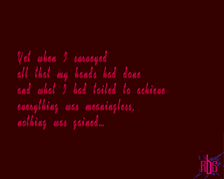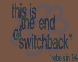 SWITCHBACK REBELS' FIRST AGA DEMO! CREDITS CODING, DESIGN AND STRESS - ZULU AND GREY - MAIN GRAPHICS - KRIS, SLIME, TEEVAAN - ADDITIONAL GRAPHICS - DEMON, ERACORE, GREY, SRL - MUSIC - CHROMAG, VOCAL - RAYTRACING - EXCESS - THIS DEMO WAS RELEASED AT THE DOOM'S DAY PARTY 1994 HELD IN KARLSRUHE! C'EST LA VIE DANS LA RUE ET C'EST TRES DUR NOUS BOUVONS NOTRE JUS C'EST JUS DE POMMES OU EST-CE JUS DE CASSIS? NON, CE N'EST PAS JUS C'EST ZULU ET GREY SUR L'ORDINATEUR AMIGA QUATRE MILLE NOUS TRAVAILLONS CHEZ REBELS ET NOTRE AMI MONSIEUR RAJOL ET AVEC NOUS ET IL SAIT - PRINCE ITAL JOE - WANTS TO CONTINUE HIS BIOGRAPHY CALLED THE LAMENT OF THE BANANA MAN... I GET A PAID HOLIDAY ONCE A YEAR. OL' AGE AN' SICKNESS CAN' TOUCH ME HERE. I HAVE A ROOM O' M' OWN, AN' A IRON BED. DUNLOPILLO UNDER M'HEAD, A MORPHY-RICHARDS TO WARM DE AIR, A FORMICA TABLE, AN EASY CHAIR. I HAVE SUMMER CLOTHES, AN' WINTER CLOTHES, AN' PAPER KERCHIEFS TO BLOW M' NOSE. MY YOKE IS EASY, MY BURDEN IS LIGHT, I KNOW A PLACE eNDLAN'! I'M NOT COMPLAININ', IF IT COL', IT COL', IF IT RAININ', IT RAININ'... ...TO BE CONTINUED! THANK YA PRINCE DIS WAS VERY INTERESTIN' AFTER THIS PLEASUREFUL BREAK, WE WANT TO THANK SOME OTHER GUYS, WHO MADE SWITCHBACK POSSIBLE... CHROMAG (YES!) DANKE FUER DIE GEILE TUNES, SCHADE DASS DU NICHT ZU ERREICHEN BIST, WIR WOLLTEN JA NOCH 3 ANDERE TUNES VON DIR VERWENDEN! SLIME THANK YOU FOR THE COOL LOGOS, WE ARE LOOKING FORWARD TO SOME OTHER GFX! TEEVAAN COOL, DASS DU JETZT AUCH REBELLISCH BIST UND DABEI NOCH GEILE BILDER MALST UND SUPER SUPPORT LIEFERST! (DAS SIND JA DREI DINGE AUF EINMAL!) KRIS AND BLOODY WE REALLY APPRECIATE YOUR EFFORT TO TRANSMIT US THE GREAT PICTURE!!! FINALLY YOU KNOW, WHO HAS THE BEST MODEM SETTINGS IN REBELS! LET'S RAISE ETERNAL FROM THE DEAD AND BRING REBELLION TO THE SCENE. EXCITER GEGEN SCHLUSS WR JA DER SUPPORT ECHT GENIAL, WENN NUR ALLE SO WAREN... BRAUCHSTE BALD EIN NEUES PHONE? VOCAL YOUR TUNE IS REALLY COOL! IT FORCES US TO INSERT THE REAL ENDPART. KEEP YOUR OWN STYLE! EXCESS WASS SOLL MAN DA SAGEN? WENN DU SO GUT BILLIARD SPIELST WIE DU RAYTRACEST, DANN ... MARVIN DANKE FUER DIE CHAOSTOUR... ES WAR WIE NE ACHTERBAHN FAHRT, BESONDERS WENNMAN HINTEN SITZT... AS THE LIST ENDS THE TEXT GOES ON... IF YOU WANT TO GET THE THIRD PART OF THE LAMENT OF THE BANANA MAN THEN YOU SHOULD TRY TO GET UNITED WITH US BY SENDING ANOTHER COOL STORY TO ONE OF THESE ADDRESSES (ZULU) OLIVER VOGEL BAHNWEG 3A 79591 EIMELDINGEN (GREY) TOBIAS SCHAECHTELIN BASLERSTR. 35 79588 EFRINGEN-KIRCHEN BOTH IN GERMANY TO ALL OF OUR 5 (IN WORDS: FIVE) WORLDWIDE! CONTACTS: WE WERE NOT ABLE TO ANSWER YOUR MILLIONS OF SENDINGS, BUT WE HAD TO PROGRAMME THIS DEMO AND WE SIMPLY REFUSE TO ANSWER THEM AS WE ARE TOOOOOOOO ELITE... NEVER BUY A PC WITH A EGA-CARD YOU WON'T GET HAPPY WITH THE PC! IF YOU BELIEVE IN VOODOO-CULT THEN YOU SHOULD GET A PUPPET AND A NEEDLE AND TRY TO PEEK... THE CHIEF OF VOODOO PEOPLE EXCITER OF REBELS IS BACK IN TOWN NOW. LET'S START THE DANCE WITH SOME PERSONAL MESSAGES AGAIN... THE WIZARDS OF THE SONIC WHO GET THE OPPORTUNITY TO BE MENTIONED BY THE MASTERBOY ARE: