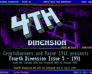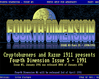 --- Part I --- 001..........................Title Page 061.......Blueprint of the STUD-missile 002.....................Contents part 1 062................The Ones Left Behind 003...........................Editorial 064.................'They' - A Problem? 004.......................Sub-Editorial 065............Exercising The Amiga Way 005........Lasse - The Ultimate Swapper 067.........Super Shinobi Sega Solution 006................Page 6 model 01/1991 071......Decorations For The X-mas Tree 008......................News & Rumours 072..................Ask Dr. Heatseeker 014.......A journey into the Amiga 3000 074............The Life Of Gentle Jerry 029.......Interview With Slayer/Scoopex 077....The Life And Times Of Nazi Fritz 035...................The Italian Scene 079....................Drammen By Night 038.......Interview With Promax/Kefrens 080.............Making Your First Intro 044.............The South African Scene 083...............No Prayer On The Road 048.............Old People - A Problem? 084.....Statements - And What They Mean 049.........There's A Jew In My Kitchen 086....Is Friendship Really Friendship? 050.......................Skateboarding 087.............Du Veit Du Er Misslykka 052..........Pros And Cons Of Computing 088...........................A Cartoon 053....Drikt V2.0 - The Story Continues 089......................Diskmag Corner 054.....................Eyes, Eyes Baby 090.........................Demo Corner 055...........................Karate-Do 999.......Enter Part two of 4D issue #5 057......................The Stoneroses --- Part II --- 001..........................Title Page 065.......Magnetic Fields Revenge Party 002....................Contents Part II 068..............The Southjutland Scene 003....................Articles Reading 070..................New Video Releases 005...........................Some News 072..........................Kidnap 'em 006....................1990 - Flashback 073.........................Sinterklaas 010...................Gossip - The Itch 074...............................Jokes 013..................Kickstart Problems 076..............The Main Event Of 1991 015.................Motala Party Report 077.......How To Order Fourth Dimension 019...Sega Mega Drive - Complete Review 078...........How To Write Articles/Ads 022..................The Swedish Corner 079.....Cryptoburners Seasons Greetings 024....The Sad Life Of A Computer Freak 080......Bookreview - All The Grey Cats 025............Some Words About Vectors 082...........................Condomery 026.........................Waterskiing 084.....................Foreign Affairs 028....................Tipp Topp Tomato 085..............................Comics 029...................The Golden Charts 086.......................Coders Corner 031.............Fourth Dimension Charts 086.......................CC:....Promax 032..................And On The 6th Day 089.......................CC:Heatseeker 033......................Advertisements 092.............................Credits 060.................The Devil's Machine 093.........................Final Words 061............Modeming With Your Amiga 999.......Enter part one of 4D issue #5 064...........................Newsflash