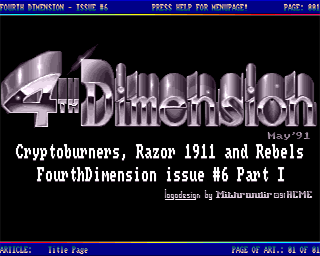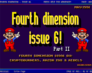 --- Part I --- 001..........................Title Page 054.....................A Note To I.C.E 002............................Contents 055.....About Fourth Dimension Graphics 003...........................Editorial 056....................The Danish Scene 004................................News 057...............Fuck Synthetic Sounds 011................Country News, Sweden 058............Germany Is Scared Of RAF 012...............Country News, Denmark 059.....Germany Is Indeed Scared Of RAF 013..........Country News, South Africa 060.........How To Pick Up A GirlFriend 014...............A Girl Cries For Help 062...........Having A Fag As A Teacher 015.................A Wonderful Weekend 064...................Letters to Editor 018...................Can We Stand Him? 067...........An Article About Lameness 019..................Drammen By Night 2 070.......................A Lamer's Day 020..............The Main Event of 1991 072................Some Hilarious Jokes 023....Interview with Bustman/Crusaders 076....................Jake's Billboard 030................The Ones Left Behind 077........................We're Pissed 031...........Reactions On Friendship 1 079.......................Jake's Corner 032...........Reactions On Friendship 2 081...............Interview With Angels 036......Seasons In The Abyss by Slayer 083..............Interview With Complex 037..............................Slayer 086...Fourth Dimension Diskback Service 038.............Book Reviews, Coq Rogue 087.............Fourth Dimension Prices 040............Book Reviews, Golden Fox 088..................Desktop Publishing 041.............Amiga 3000 Hints & Tips 091...........................Eces 1991 046..A Journey Into The Amiga 3000 pt.2 094.......................Hey Mr.Orland --- Part II --- 001..........................Title Page 055..........................Indiemusic 002............................Contents 057.........................Intoxicated 003........Fourth Dimension Demo Corner 061........................Genlock-Test 020.......Fourth Dimension Chart Attack 062...................Neuromancer Codes 025........................Vote Damnit! 064...................The Golden Charts 026.................Deluxe Sound Review 065....................Ask Mr. Axworthy 028...........The Sega Megadrive Corner 067......................Diskmag Corner 036................Megacity - The Novel 068...................Musicians Hangout 044......Never Neverland by Annihilator 072.......................Music Reviews 045............Dexion X-mas Partyreport 074.......................Coders Corner 047....Anarchy Winter Conference Report 077......................Advertisements 050.............Spending Too Much Time? 100...........................Apologies 051................Reactions On Ripping 101..............................Comics 052....................Release Yourself 105.............................Credits 053...............Thoughts About Racism 106...................Phonomenal Poetry 054.........The Quality Of Dutch Movies