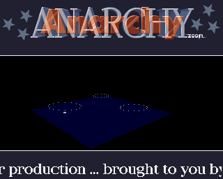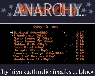 Ronan of ANARCHY is proud to present Melodies' Springs, the very first Muzik-Disk from ANARCHY Fr . All coding by Ronan, Muzaks by Nhp & Bkh, Gfx by the world famous Zoom, Moral and TeuTeu support by Tibo-SFC-Rookie, 'Over' Laming and dissupporting by Performer 'The Sprite' I (Ronan) send some personal greetings (as usual!!) to my best friends on the scene: Redlight-Antony-Moby-Gryzor-Sun / Dreamdealers Thomas Landspurg Motif-Tristan-Skrew-Splitter / Melun Corporation Major Fatal-Sacha / Mystics (ST) TMB-Design / TSL Lord Helmet / PMC Audiomonster-DCA / TSL Fr Batman / 77 Crew and of course to all ANARCHY Members Worldwide ... Conquest & Rhod on the keyboard ... Another party, another production ... brought to you by the fadas at anarchy hiya cathodic freaks ... bloody conquest is at last back on the lines !! Pheww ... I alrighty would like to say to all the people who shrug not to believe us (herr..!?) 'here it is' ... spring melodies ...released during the TRSI Easter Conference held here in Louvain/Belgium on 18th and 19th of april 1992!! As Nhp might have already stated, it has been put together during the previous days by ronan and the gfx are from this brilliant artist nicknamed Zoom! The french musicians duo Nhp-Bkh are responsible for the pieces you're about to listen! So turn on the hype and prepare yourself for a fantastic trip to Anarchyland ... To get in touch with us for any reason, send a mail to: Anarchy - PO Box 37 - 45700 Villemandeur - FRANCE ! or call our american bbs : Powerhouse +1 713 998 9042 and Mystic Place +1 513 746 4532!!! Keep your drives ready for the coming soon second slide show from Zoom! Another important thing, you've probably heard of the new pack serie from Anarchy called Infestation ... to publish your production in our collection just send it to the same adress and you'll of course get back the latest issue of Infestation! The serie you can't escape the confines ... That's enough!! Now are coming some messages from us to some members of the Amiga connection! This is Rhod hammering this keyless keyboard with a screw ... I just want to greet the following dudes: William of Andromeda, Screwface of Frantic, Nick of Rebels, and Mole, Trix, Pinny, Cybersonik and Rookie from where you probably know ! Special note to Surfer's mailcontacts : you won't get any answer from him by now so write back to the French HQ, cause it's too much work to recontact you all! Remember ... only sheer elite !!!! Zoubida ... by the road, this is conquest now sending messys to some anarchists out there!! What a shame I couldn't make it to the Barnsley Party, but uni rules our lifes ... At least, you've enjoyed yourself !! Hi Drokk ... the newest Stolen Data is outright well layed out !! I understand why you got so much pressure before the party!! Hear you soon ... Hallo Trix ... you're probably partying in Norway at the moment!! Unluckily, the remaining time before you left was too short to complete this work! Catch you in another coool phonecall!! Hey Pinny ... stickers are on their way! have fun wild german!!! Hallo Facet ... hoe gaat het in Holland? Verbaas je er niet over dat ik een beetje nederlands spreek, want ik heb lessen gevolgd ... poising, no! Congratulations are flying over Krest and Critical Mass for your leftovers intro?!? And to Dan, Nuke and Facet for your legalise it ... Hope you'll enjoy spring melodies as much as we enjoyed your work!! What about you visiting us? France is furthermore less bombed country than england!!! Hey Krest ... I'll show you how to cook frogs leg a la sauce bechamel ... Really tasty! And last but not least to 4-Mat ... That's really great to have such a musician back with us!!! My best regards are sent to all other members of our crazy team around Denmark, England, Germany, Holland, Usa and especially in France where they might hear me more often!!! We take the most of this event to salute all the party freaks here in Louvain ... Take note: french fries are bad for health when high consummed !! Ok ... it's late and the rave as started so follow us ... Anarchy send greetings to the following: Agile - Agnostic Front - Alcatraz - Amonia - Andromeda - Atlantys - Aurora - Awesome - Axis - Black Robes - Brainstorm - Byterapers - Complex - Crystal - Cytax - Delight - Desire - Devils - Digital - Dreamdealers - D-tect - Dual Crew - Fairlight - Frantic - Fusion - Image - Kefrens - Legend - Majic 12 - Noxious - Palace - Phenomena - Pmc - Rebels - Sanity - Shining - Silents - Spirit - Supplex - Static Bytes - TRSI - Vanish - Vectra - Voice - Wizzcat - Zenith - Zero Defects and that's all at the moment ... See you later alligators! Copyright ANARCHY - 1992