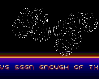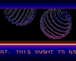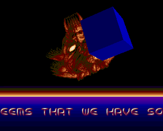 OK FOLX, LETS SHOW A NICE LITTLE CUBE! ANYTHING ABOUT A BACKGROUND ??? NOW LETS CONTINUE TO ROTATE THIS STUNNING PICTURE WITH OUR STUNNING REALTIME-ROTATOR, OH, OOOPS, IT SEEMS THAT WE HAVE SOME SPARE PROCESSORTIME! ROTATIONS ARE SOOOO EASY!! ENOUGH BITMAPS, LETS DO SOME DOTS: 10 INDIVIDUALLY ROTATING DOT-SPHERES... BUT WE HAVE SEEN ENOUGH OF THIS DOT-SHIT, WHY DONT WE DO BOB-SPHERES? HERE THEY ARE! WE HAVE TO FINISH THE DEMO-PART, THIS OUGHT TO BE A MUSIC-DISK, WE BETTER CONTINUE NOW