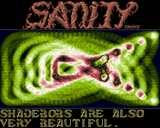 NOW YOU REACHED THE END OF THE DEMO! NOTE THAT THIS DEMO: - RUNS ON A500-A3000 - IS GENLOCK COMPATIBLE ! - LOOPS WITHOUT ANY KEYSTROKE - IS 99 PERCENT VECTOR FREE - IS 100 PERCENT GLENZ FREE - RUNS ON 7.14 MHZ 512K AMIGAS IN FULL SPEED - FOR THE FIRST TIME IN A SANITY DEMO NO OFFENDING SCROLLTEXT! YEAH! PRESS RIGHT BUTTON TO SEE MORE TEXT!