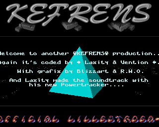 Welcome to another *KEFRENS* production.. Again it's coded by > Laxity & Vention <. With grafix by Blizzart & R.W.O. And Laxity made the soundtrack with his new Powertracker....