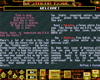 EDITORIAL MELON BIRTHDAY -------------------------------------- -------------------------------------- Welcome Melon Birthday - A real flop! How to use Upstream What actually happened? Moduleinfo Words from the organizer Credits Letters from the Public THE REVIEWS Upstream addresses -------------------------------------- Note to PD-firms Diskmags We need writers! Demos Corrections Competition - Huge prices! MUSICIANS CORNER -------------------------------------- NEWS Editorial -------------------------------------- An easy way to make Chipsamples News editorial What does Protracker need? The official scenenews A-D Musicplayers - The big pain! The official scenenews E-Z Techno is NOT easy! News for the Masses Review of Bjørn A. Lynnes new tape! To be released soon Alternative News CODING CORNER -------------------------------------- THE SCENE A rundown on Languages -------------------------------------- Make EXIT possible! Sue the Diskmags Rednex - Back again ELECTRONICS AND HARDWARE Diskmags - Leaders of the scene -------------------------------------- Party - At it again! Amiga 5000 - It's here!!! The stalling Charts Amiga 1400 - More rumours Being an Editor - Joy or pain? New Amiga 1200 sound!!!!! Finnish scenereport Dual disk formats! R.W.O. - A Casanova in trouble! How to make level 7 switch! Hardcore Design: We're not Nazis! Famous Musician with racistic opinions ENTERTAINMENT The crazy Scene-types -------------------------------------- Emergency scene-help!!! The Horrorscopes for the Scene The Joshua disaster bust Peanuts BBS - A hard one to crack! The case of Freaky Angel - The bust! Hillarious Corner Tell what you are! Murphy's Computer Laws Silence of the Scene! Balance involved in booze-scandal! Main Editors in Questionfire Shit Happens Part II Magpoll Chart Scene Soap Opera Episodes 5 & 6 NO Spanish Balance FINALLY - Books about the scene! The rise of Alcatraz What's the logic?!?!? No real demo development! YAK! What a meal! Stop worrying - It's for fun! White Label - Against racism! THIS'N'THAT Melon, Lemon. - A plaque! -------------------------------------- Quasar - Lots of fun with a Lazergun UPSTREAM CHARTS Slaves of Technology -------------------------------------- Computing will kill you! Charts Editorial Brilliance - Dpaint is down! The Results Into The Mist - SCANDAL! List of Voters Into The Mist - Operation Majority Glamerous news! THE WARZONE Train your brain - A test -------------------------------------- Malta - A censored country! Nuke the Warzone!!! Speedy defends himself CYBER PUNK WOTW - Biggest cheat! -------------------------------------- Open letter to Sceptic Introduction The War Profiteers CyperPunk in Comics! What is CyberPunk? INTERVIEWS -------------------------------------- ADVERTISEMENTS Bjørn A. Lynne - A married man! -------------------------------------- Speedy / Parasite - No. 1 swapper! Important! Zinko / Kefrens - The Melon-thrower! Advertisements part 1 Cutcreator / Static Bytes Advertisements part 2 Tedric / Silents Advertisements part 3 Skol / Anthrox Advertisements part 4 Tin / BRS Prods visits Norway New Bjørn A. Lynne tape Cesium / BLC - A portrait BACKPAGE THE PARTY CRASHER -------------------------------------- -------------------------------------- Thanks Southern Party '93 - Report Next issue Galemands '93 - Total destruction! Press ESCape to exit! (But why?!) Saturne Party '93 - Report Somewhere in Holland - Report ECC '93 - Report The Party 3 - Invitation The Party 3 - Big changes! The Gathering '94 - Preinfo