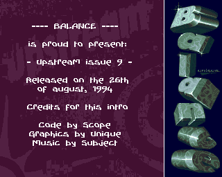 ---- BALANCE ---- is proud to present: - Upstream issue 9 - Released on the 26th of august, 1994 Credits for this intro Code by Scope Graphics by Unique Music by Subject