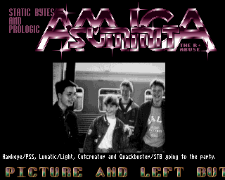 PROLOGIC AND STATIC BYTES ARE PROUD TO PRESENT: AMIGA SUMMIT CONVENTION 91 PARTY SLIDESHOW. IT CONTAINS PICTURES TAKEN BEFORE, DURING, AND AFTER THE PARTY. AT THE BOARD IS PLAYBOY OF PROLOGIC. FIRST SOME INSTRUCTIONS: PRESS RIGHT BUTTON FOR NEXT PICTURE AND LEFT BUTTON FOR PREVIOUS PICTURE. AND NOW... THE CREDITS: CODING BY THE ONE OF PROLOGIC. LOGO BY THE R OF STATIC BYTES, ASSISTED BY ABUSE. SCROLLFONT BY TMB DESIGNS OF PROLOGIC. MUSIC BY CUTCREATOR OF STATIC BYTES (I JUST LOVE THIS MUSIC. THE ONE) THE PICTURES WERE TAKEN BY PLAYBOY OF PROLOGIC DIGITIZING DONE BY: TOM OF NASA SOFT AND VIDEO (THANX PAL). ANYWAY I THINK THAT IS JUST ABOUT IT. NOW, AS MOST OF YOU MUST HAVE HEARD, THERE HAVE BEEN SOME INTERNAL TROUBLE IN PROLOGIC. BUT LET ME STATE THIS ONCE AND FOR ALL: PROLOGIC IS NOT DEAD. THE PSYCHO TROOPER, DMI, THE GUARDIAN, AND VENTION LEFT COS OF THE INTERNAL PROBLEMS. KRUEGER JOINED AWESOME. TSC, JTF, AND VIRUS JOINED BUDBRAIN. DEFICE SOLD HIS COMPUTER. BLAZER AND TRANCE LEFT COS THEY WANTED TO DO REAL MUSIC. PHEEEEEEW, THAT WAS QUITE A FEW CHANGES DONT YOU THINK... ANYWAY THE REMAINING MEMBERS ARE IN DENMARK: TRASHCAN (ORGANISER, MUSIC) THE ONE (CODER) AMOK (CODER,GFX) BLACKBURN (DESIGNER,MUSIC) LORD ALF (CODER) TAMA (MUSIC) HAWKEYE (SWAPPER,SPREADER) BLITBOY (CODER) THE WHISTLE (CODER,MUSIC,GFX) BEATLE JUICE (MODEM TRADER,SOON SYSOP) PLAYBOY (SWAPPER,SPREADER) IN FINLAND: ACE (MODEM TRADER,SYSOP ON DIGITAL REALITY) ALSO SOME NEW MEMBERS HAVE JOINED PROLOGIC FINLAND, LOOK IN COMING PRODUCTIONS FOR MORE INFO ON THAT. AND FINALLY IN NORWAY: TMB DESIGNS (GFX)... (GREEEAT GFX. THE ONE) NOW I (THE ONE) WANNA MAKE A LITTLE INTERRUPT, IN ORDER TO SEND A COUPLE OF GREETINGS TO SOME FINE PEOPLE IN THE SCENE: ACBS OF RAM JAM ZOZO OF MAJIC 12 HYDRO OF FRANTIC BARRAX OF EUPHORIA THE CYBER PIRATE OF AXIS THE SPY OF CRIONICS AND OF COURSE ALL MEMBERS OF STATIC BYTES AND PROLOGIC. NOW QUACKBUSTER OF STATIC BYTES WANTS TO SAY A FEW WORDS, SO HERE WE GO: YEEEAAAAH!!! QUACKBUSTER OF STATIC BYTES IS ON... I AM HERE TO WRITE SOME GIGABYTES OF BOREDOM IN THIS COOL SLIDE. THE REASON WHY I AM HERE IS TO GIVE MY OPINIONS ABOUT SOME PROBLEMS IN THE SCENE... WELL, I MIGHT AS WELL START RIGHT NOW .... HAVE YOU SEEN THE DEMO, WHICH FLASH PRODUCTION RELEASED AT THE AMIGA SUMMIT 91... YEAH ... THE ONE WITH THE UGLY BUDBRAIN ANIMATION IN THE BEGINNING. LATER ON THEY SHOW A LIST OF PEOPLE WHO WANT BUDBRAIN TO CHANGE THEIR DEMO STYLE. I THINK THIS IS A REALLY UNFRIENDLY BEHAVIOUR FROM A FRIENDSHIP GROUP. I MEAN ... WHO WANTS TO WATCH THE SAME BORING VECTOR OBJECTS IN EVERY GODDAMN DEMO, JUST BECAUSE THEY HAVE BEEN OPTIMIZED A BIT SINCE LAST TIME... BUDBRAIN'S DEMOS MAY NOT CONTAIN AWARD WINNING CODE, BUT INSTEAD THEY HAVE ENTERTAINMENT AND GREAT IDEAS. IF ALL DEMOS WERE ALIKE (AND THEY ARE ALMOST BY NOW), THEN IT WOULD VERY SOON GET VERY TEDIOUS TO WATCH DEMOS. THINK ABOUT IT... AND BUDBRAIN IS NOT THE ONLY GROUP WHO HAVE RELEASED DEMOS WITH LITTLE OR NO CODING. JUST THINK ABOUT RED SECTOR'S FOLLOW ME AND SCOOPEX' CHROMIUM. WERE THEY MASTERPIECES IN CODING... NO. SO ... TO CONCLUDE THIS, I WILL SAY, THAT IF ANY MEMBER OF BUDBRAIN SEES THIS, I WANT YOU TO KNOW THAT I AM FULLY SUPPORTING YOUR WAY OF MAKING DEMOS. AND I HOPE TO SEE MORE OF YOUR WORK IN THE FUTURE ... FOR THE SAKE OF THE DEMOSCENE. REMEMBER THAT THIS WAS ONLY THE OPINION OF QUACKBUSTER OF STATIC BYTES, AND NOT THE OTHER PSS OR STB CREW MEMBERS... IF YOU WISH TO SWAP WITH STATIC BYTES, THEN YOU SHOULD WRITE TO THIS ADDRESS ... RASMUS HOUGAARD GULDBERGSGADE 6 8600 SILKEBORG DENMARK BEFORE I LEAVE THE KEYS TO ANOTHER GUY, I WILL SEND SOME RED ROSES TO MY BEST FRIENDS IN THE SCENE (SORRY, IF YOU ARE NOT INCLUDED.) LETS GO ... TUBORG OF WHO KNOWS ... GHOUL OF ARCANE ... DEZZ, LUNATIC AND KOLLAPS OF LIGHT ... CHRISTER OF PALACE ... AGGRESSOR OF CRYPTOBURNERS ... OMEGA AND JANITOR OF REBELS ... DR. LEGAL OF RAF ... STRANGER OF AGILE ... MM OF DARK AGES ... ODIE OF BRAINSTORM ... ZEDY OF QUARTEX ... GRIM JACK OF UTOPIA ... AND LAST AND LEAST (JUST KIDDING) HAZY MIND OF WIZZCAT WELL QUACKBUSTER OF STATIC BYTES IS FADING AWAY ... KAN I HYGGE JER... NOW, THE ONE OF PROLOGIC IS BACK. BUT ONLY TO TELL YOU THAT THIS SEVERAL KBYTES (WOW) LONG SCROLLER IS GOING TO RESTART IN A FEW BYTES. SO THIS IS THE END. BYE FOR NOW, AND SEE YOU ALL THIS SUMMER AT THE SILENTS AND CRIONICS CONFERENCE