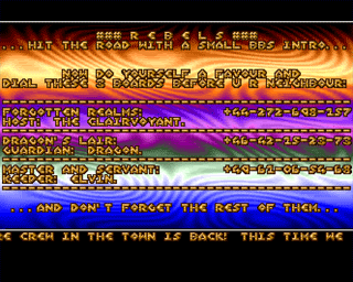 ### R E B E L S ### ...HIT THE ROAD WITH A SMALL BBS INTRO... NOW DO YOURSELF A FAVOUR AND DIAL THESE 3 BOARDS BEFORE U R NEIGHBOUR: ----------------------------------------- FORGOTTEN REALMS: +44-272-698-157 HOST: THE CLAIRVOYANT. ----------------------------------------- DRAGON'S LAIR: +46-42-15-23-73 GUARDIAN: DRAGON. ----------------------------------------- MASTER AND SERVANT: +49-61-06-54-68 KEEPER: ELVIN. ----------------------------------------- ...AND DON'T FORGET THE REST OF THEM...