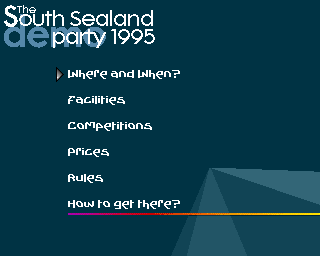 Focus Design is once again arranging THE SOUTH SEALAND DEMO PARTY '95. It'll be from: 7th July 95, 10.00 to 9th July 95, 19.00 Again at Islingeskolen in Vordingborg, Denmark. The price is very fair, only 140 Dkr. It's the party where Virtual Dreams "LOVE" were released last year. This year it's recommendable to pay in advance. Mainly because you'll get it a lot cheaper, but also because you can book a V.I.P.-room (no extra cost). We have a limited number of V.I.P.-rooms so please report us soon. If you pay in advance the price will be 120 DKR. You can pay the money on the post giroaccount: no. 1 63 33 30 26 Dorte Andersen Skoleparken 5, 2nd, door 2 4760 Vordingborg Denmark Att: South Sealand Write your handle too on the blanket. Tell us how many who'll show up from your group. Pay the money as fast as possible. If the party is cancelled in any way then you'll ofcourse get your money back.